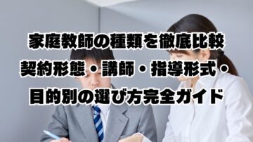 家庭教師の種類を徹底比較|契約形態・講師・指導形式・目的別の選び方完全ガイド はじめに:家庭教師選びの重要性 お子様の学習サポートのために家庭教師を検討しているものの、「どんな種類があるのか分からない」「どれを選べばいいのか迷う」という保護者の方は少なくありません。 家庭教師には、契約形態、講師の専門性、指導形式、指導目標という4つの視点から様々な種類があり、それぞれに特徴、メリット、デメリットが…