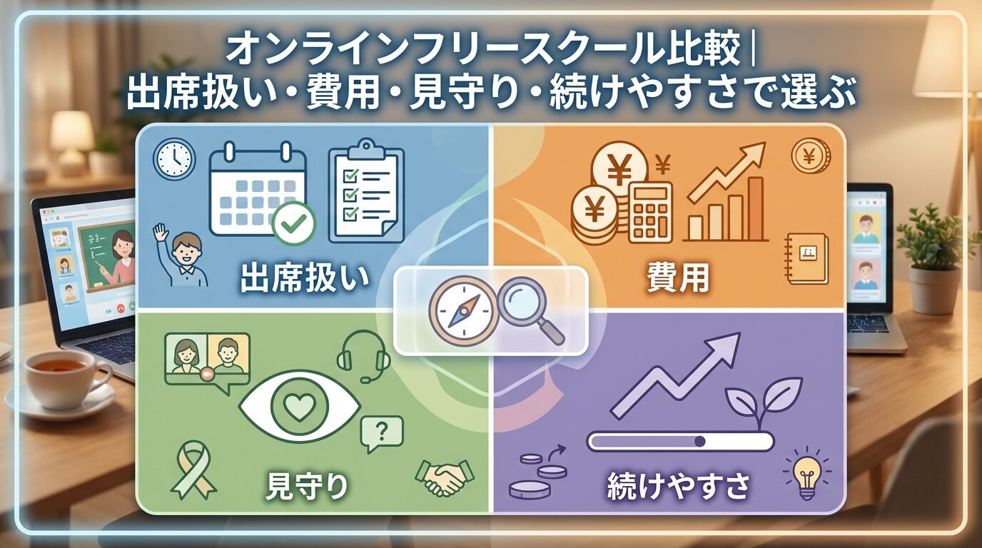 この記事では、オンラインフリースクール比較で迷いやすいポイントを、出席扱い・費用・見守り・続けやすさの4軸から整理しました。
