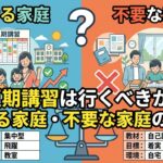 夏期講習は行くべきか?受ける家庭・不要な家庭の違い 2026年の夏期講習を検討する時期になると、「受けないと遅れるのでは」と不安になりますよね。ですが、夏期講習は全員が同じように受けるべきものではなく、学年や今の課題、家庭での学習の回し方によって必要性が変わります。 夏期講習を受けた方がいい家庭と、…