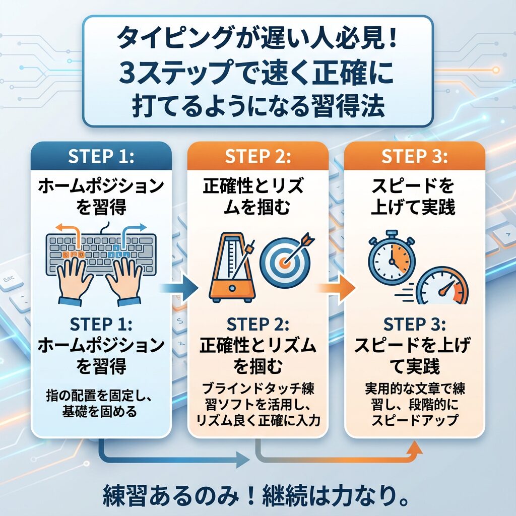 タイピングスキルは、以下の3つのステップを順番に習得することで、確実に向上させることができます。